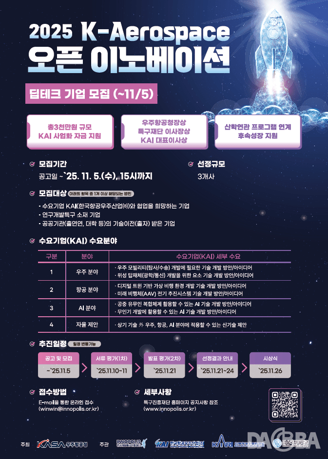 [사천=다바뉴스(DABA)] 정부가 ‘2025 K-Aerospace 오픈 이노베이션’을 통해 우주·항공·AI 딥테크 기업 육성을 본격화한다.
